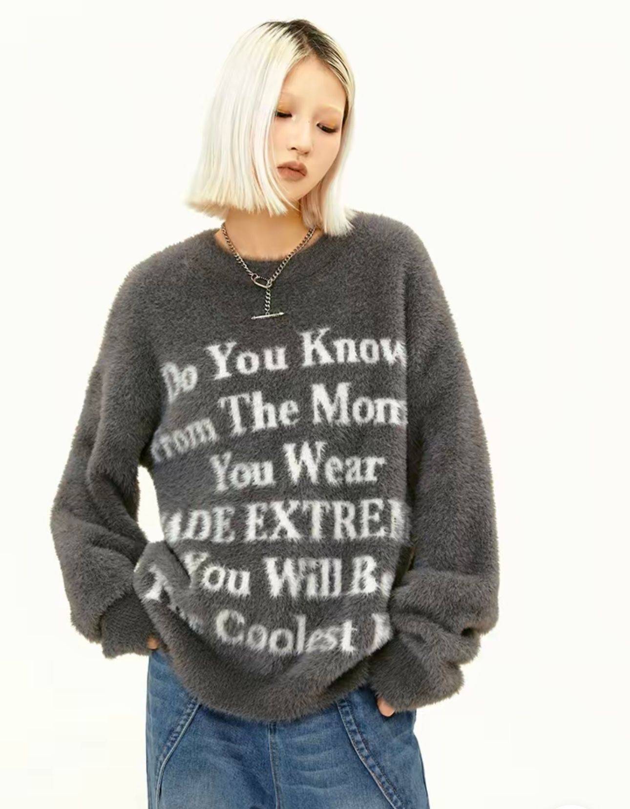 美式复古嘻哈毛茸茸字母提花长袖针织衫