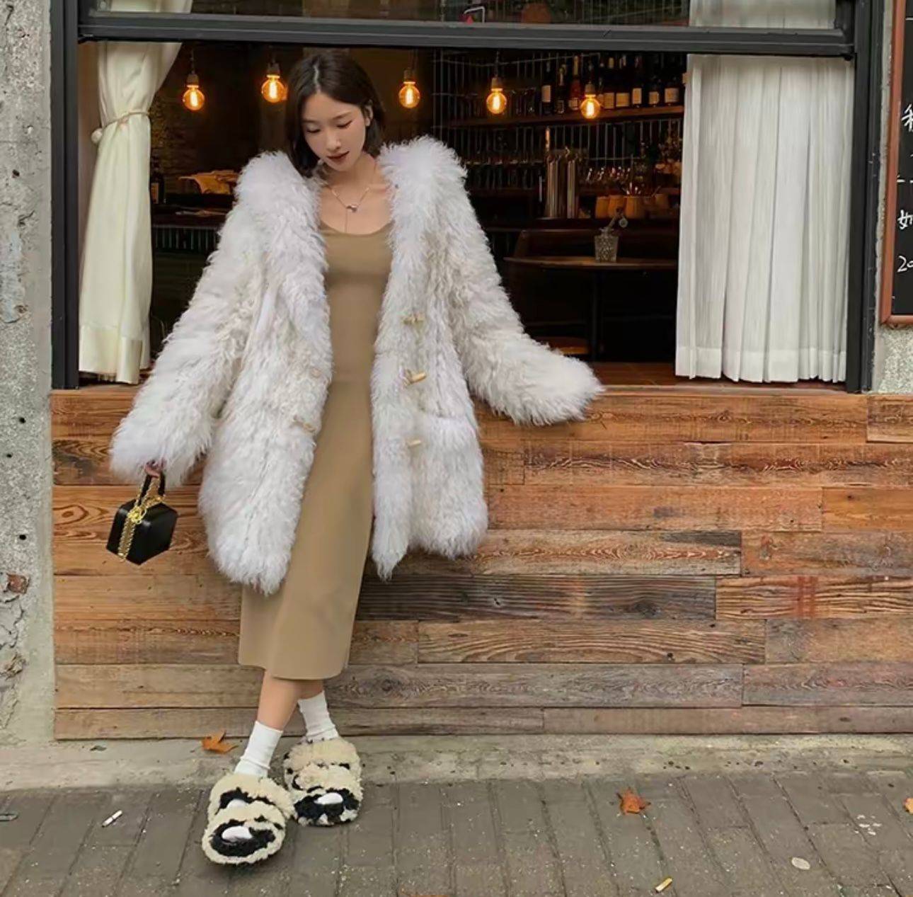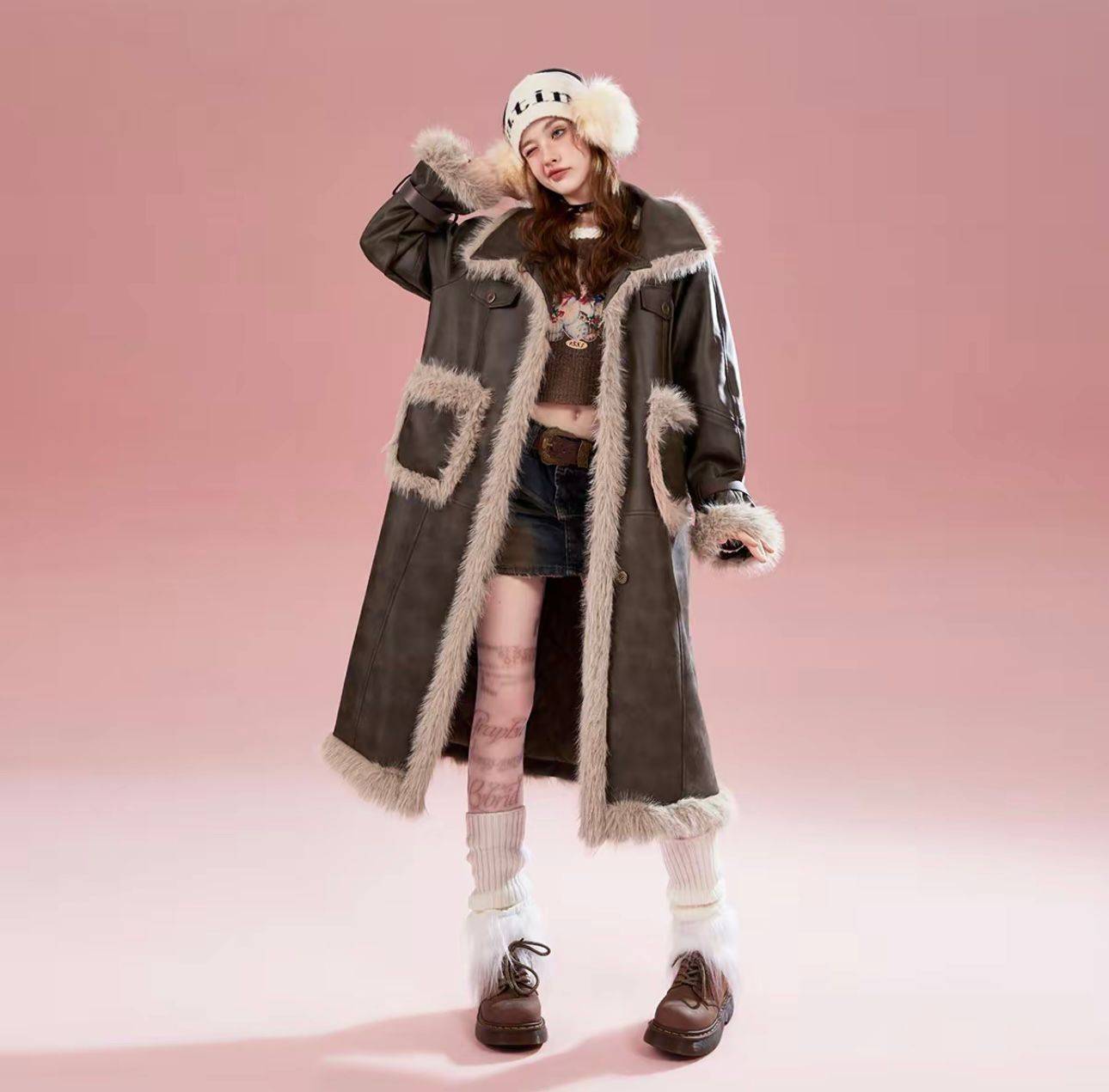 美拉德风金属扣服饰长款防皮毛一体外套皮衣女款棕色