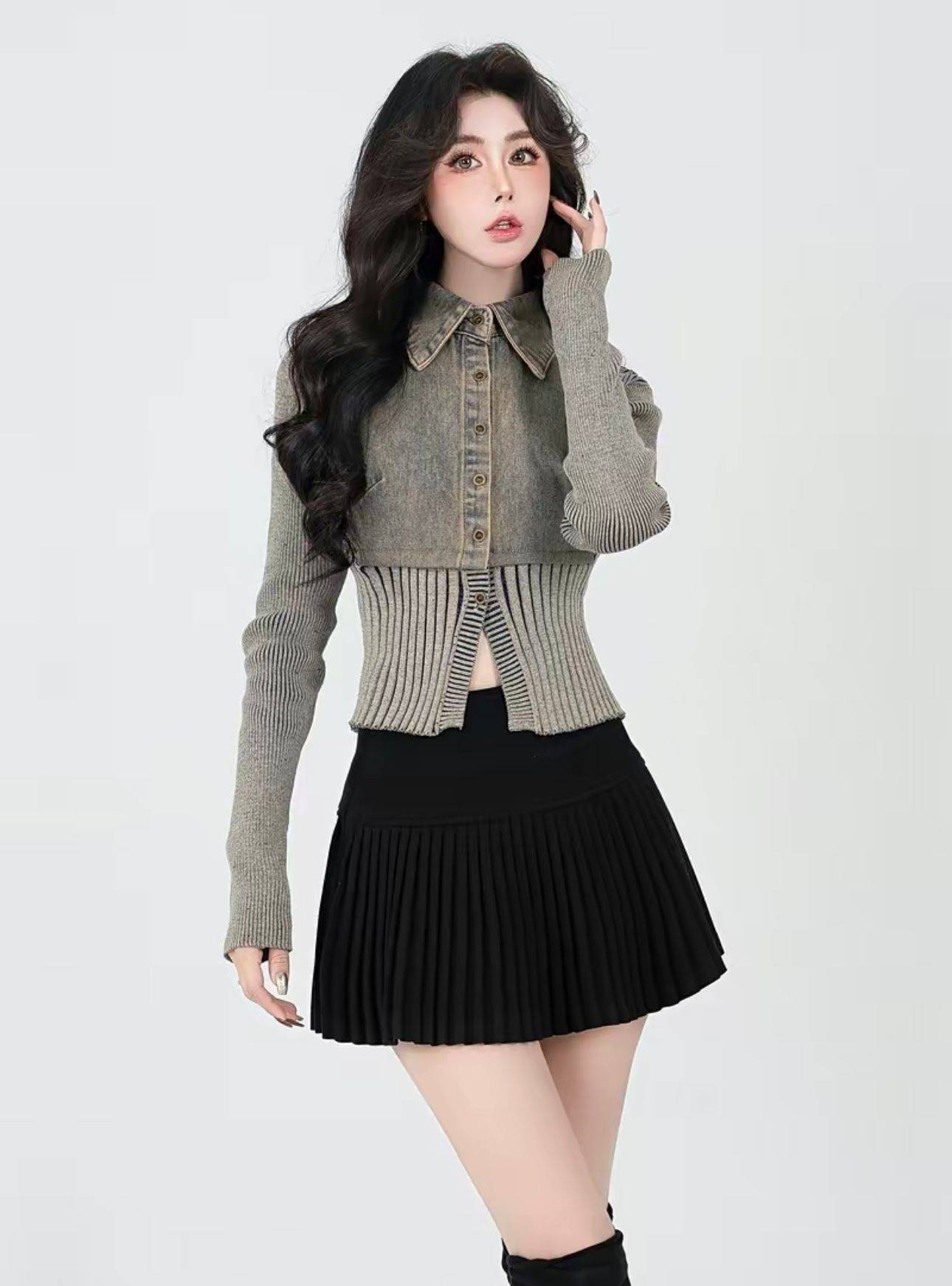 休闲舒适牛仔拼接长袖短款修身针织衫