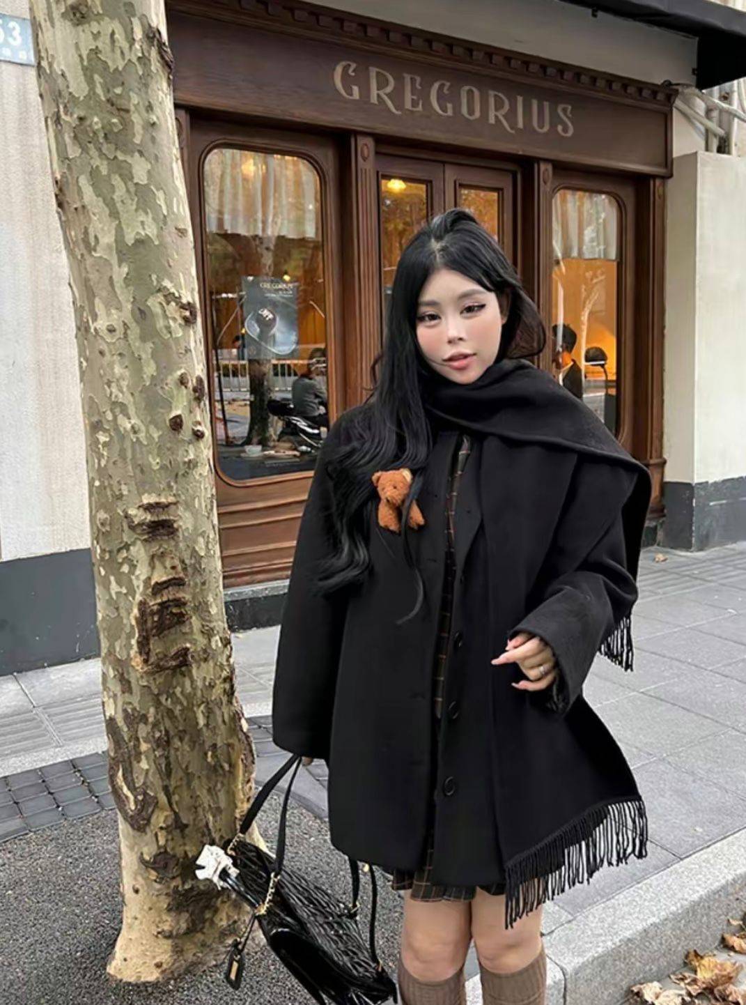 微胖mm2023冬季新款设计感保暖显瘦中长款毛呢围巾大衣