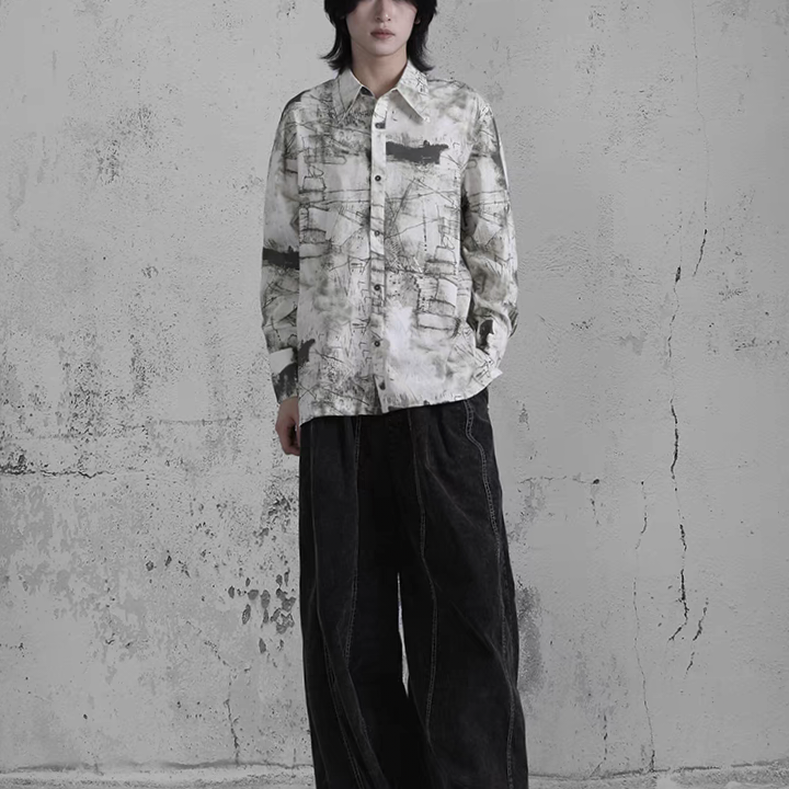 复古绿色长袖印花衬衫宽松翻领扎染文艺衬衣