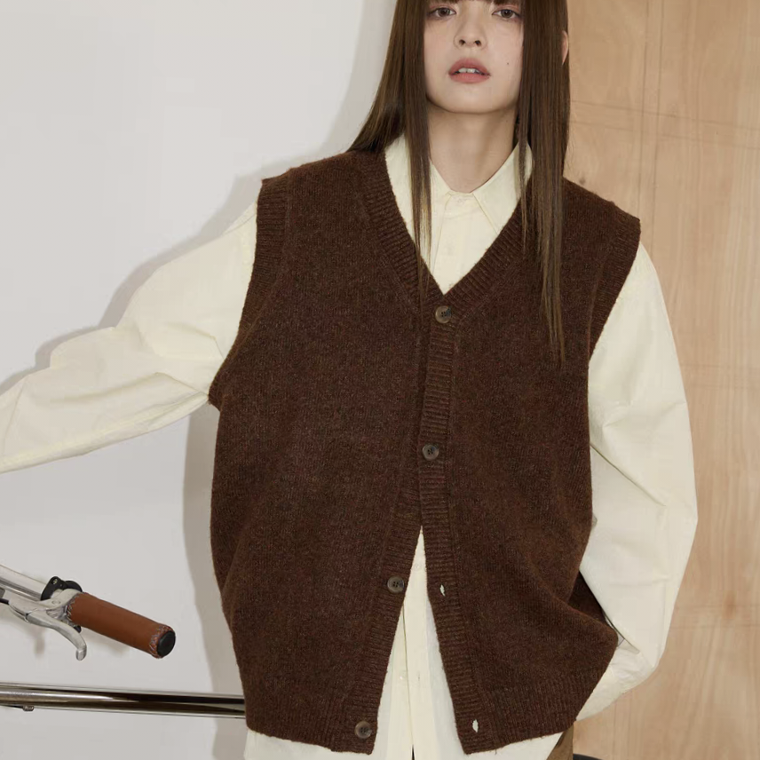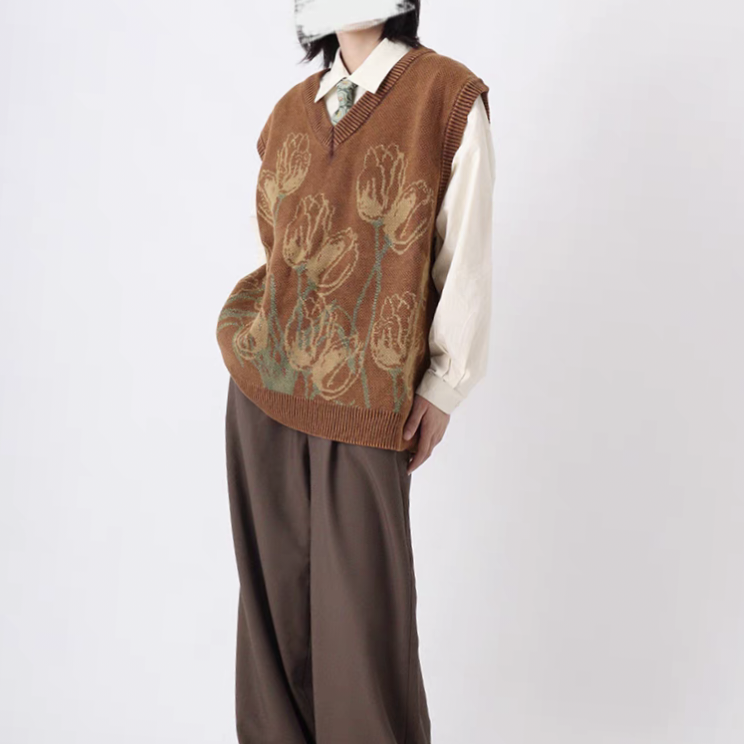 日系复古男女慵懒宽松廓形毛衣背心提花针织马甲