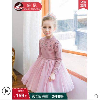船鼠女童毛衣裙子2019新款秋冬童装针织网纱洋气公主裙儿童连衣裙