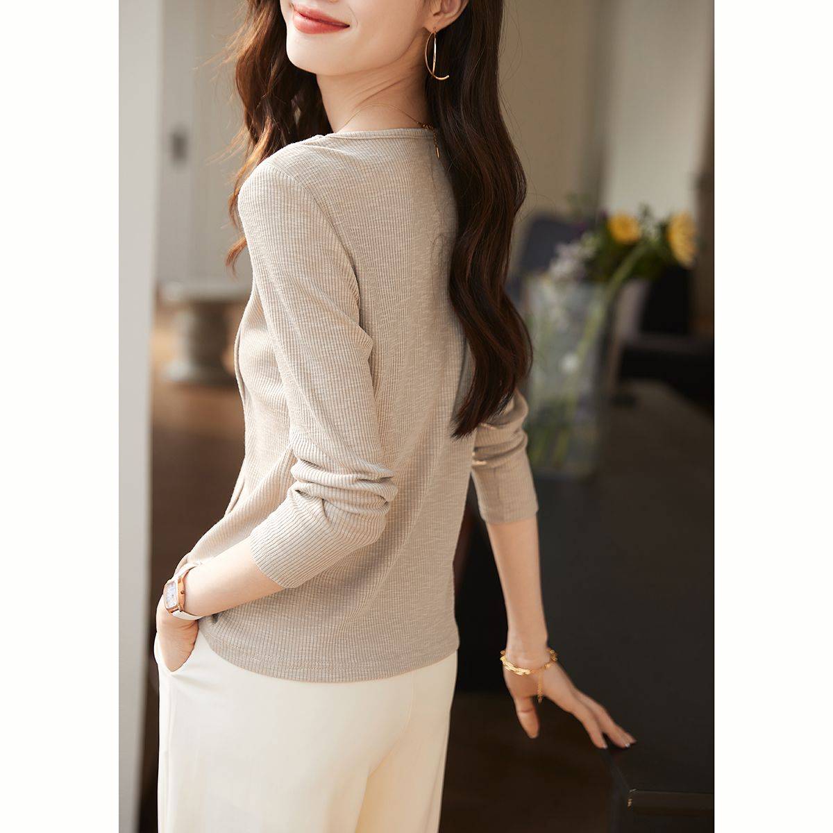 MOHO&MO 2024秋季新款休闲简约高级设计感镂空显瘦百搭长袖T恤女