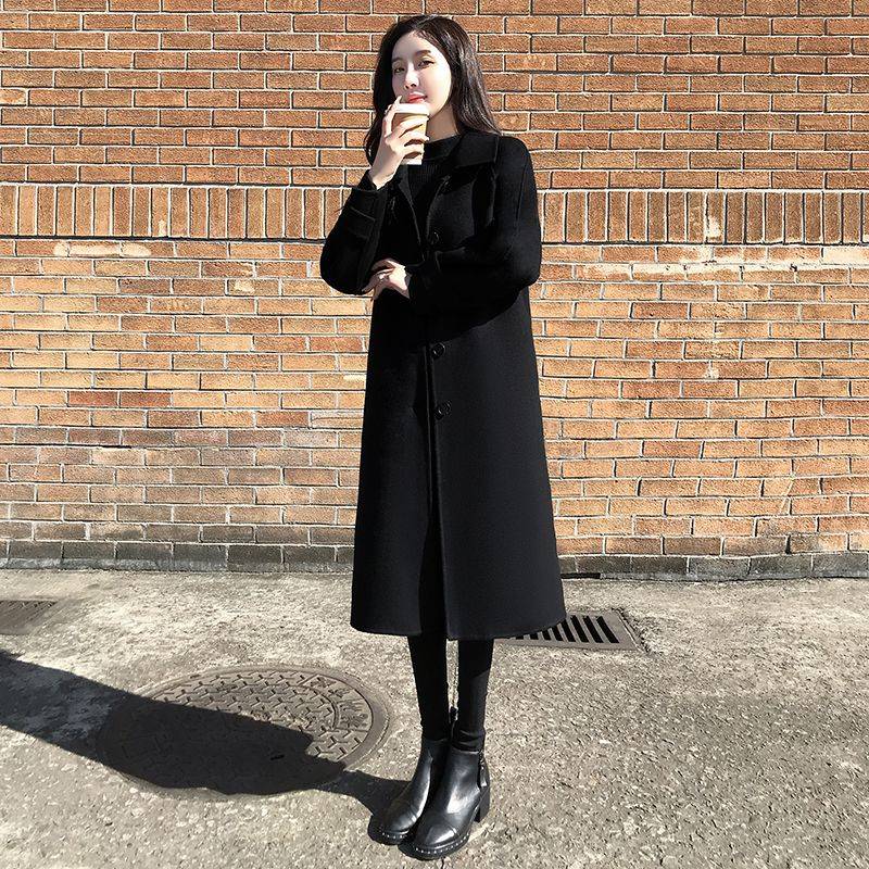 双面羊毛大衣女中长款2020新款赫本风黑色腰带秋冬毛呢外套西装领