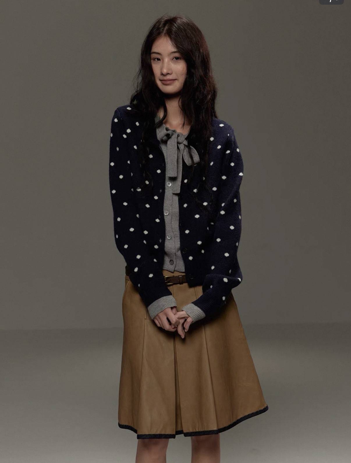 原创设计蝴蝶结系带波点假两件宽松休闲毛针织开衫外套女