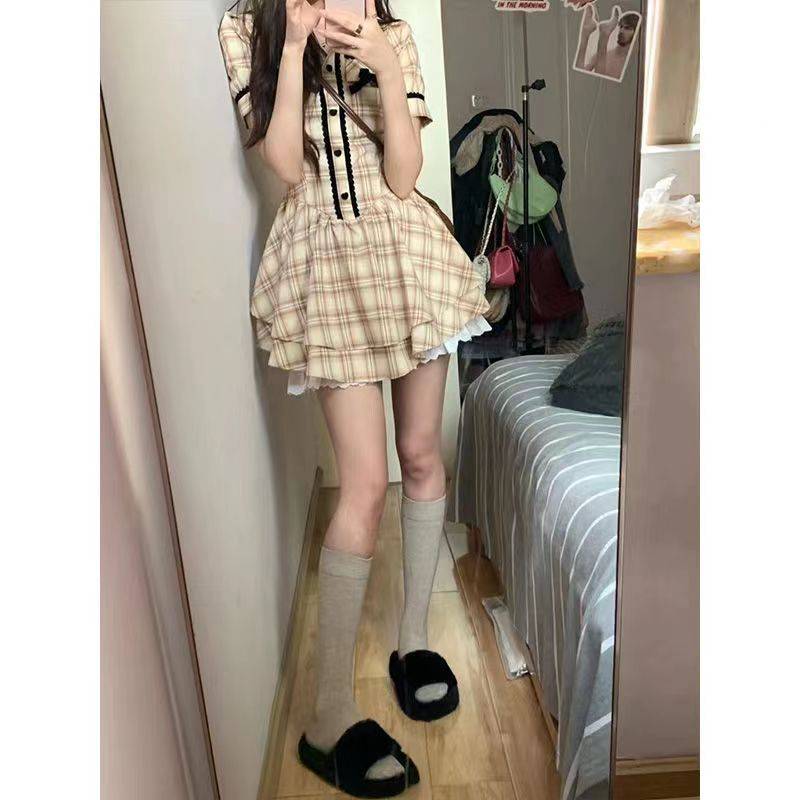 复古盐甜系辣妹纯欲风衬衫格纹设计感收腰蛋糕连衣裙少女夏小个子