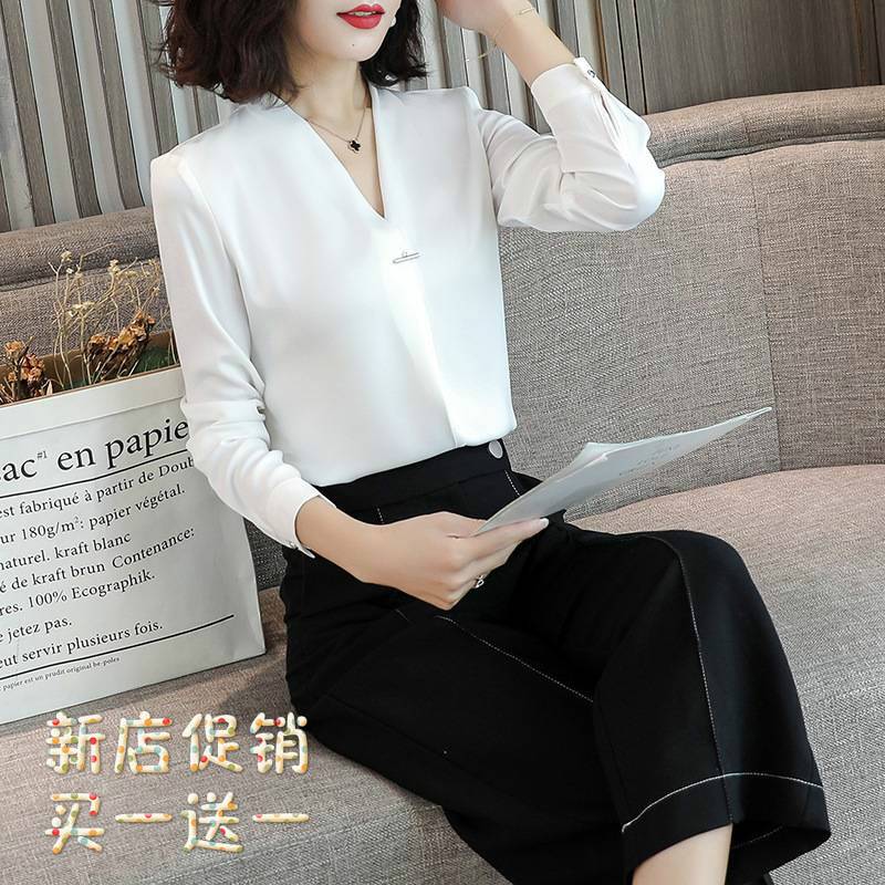 长袖衬衣 女装 2019春职业女士衬衫女夏 韩版时尚v领雪纺衬衫女