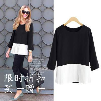 2018春新款女装大码中长款百褶拼接宽松雪纺衫T恤上