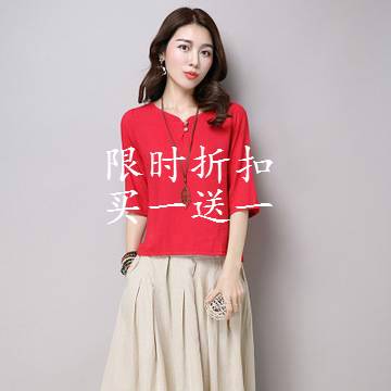 2018夏女装宽松民族风纯色七分袖苎麻棉麻亚麻衬衫上衣T恤