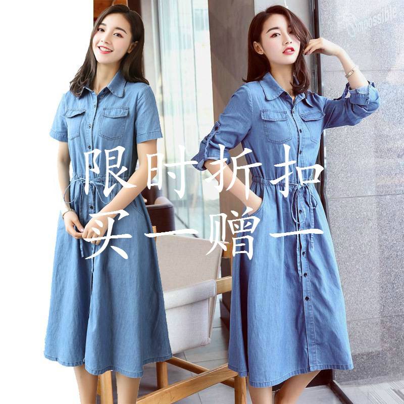 新款牛仔长裙2019春季新款女装韩版宽松中长款长袖衬衫牛仔连衣裙