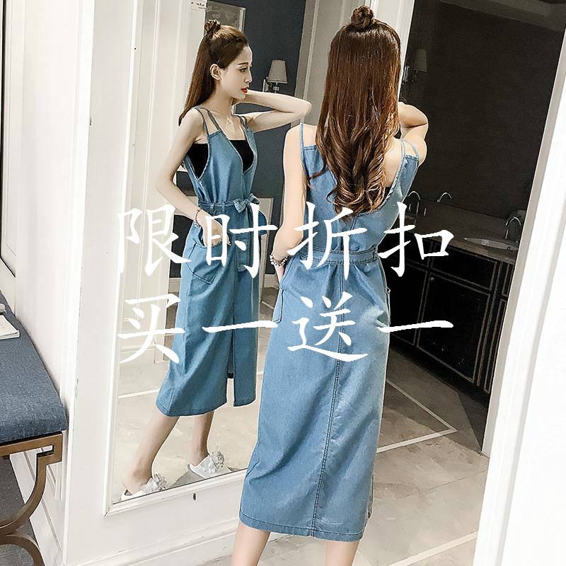 2019夏季新街头欧美背带长裙V领露背宽松吊带长款牛仔连衣裙女装