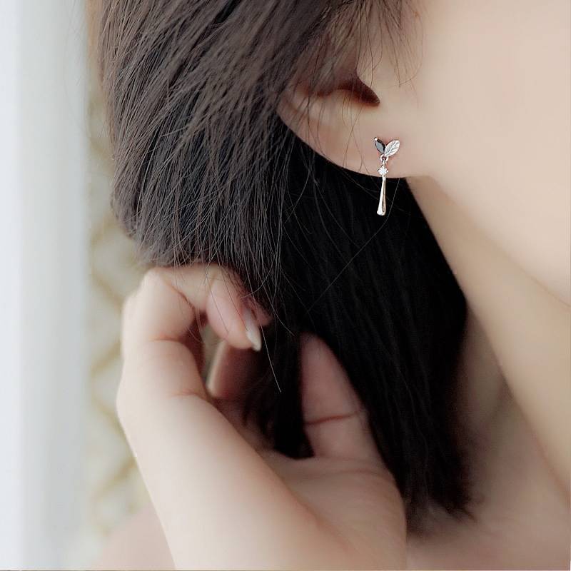 小Z优品925纯银精致清新可爱叶子锆石迷你小耳钉耳坠耳饰学生