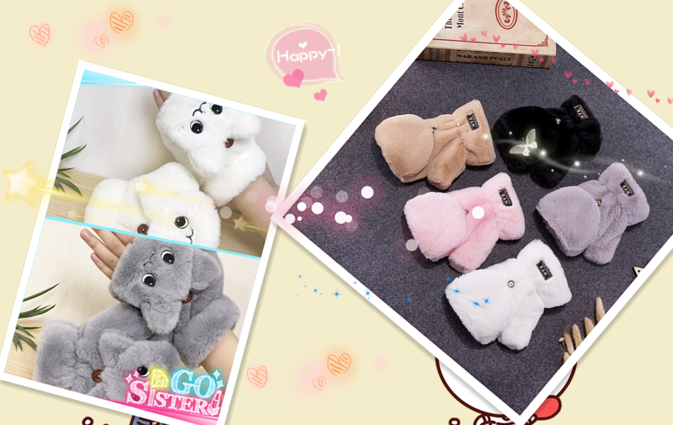 手套女冬天可爱翻盖毛绒加厚韩版学生半指毛茸茸露指保暖加绒防寒
