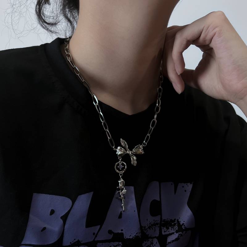 KANSAI新款玫瑰蝴蝶结项链冷淡风毛衣链小众配饰个性嘻哈饰品潮流