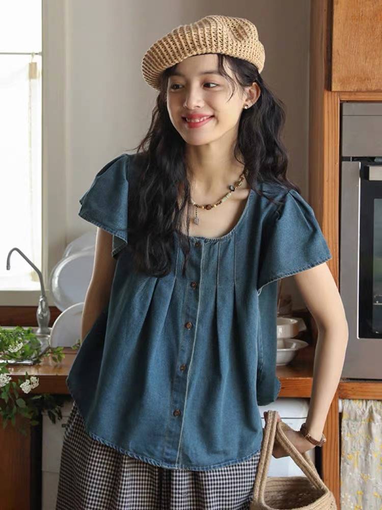港味复古元气薄牛仔衬衫上衣女夏季新款宽松百搭气质减龄别致衬衣
