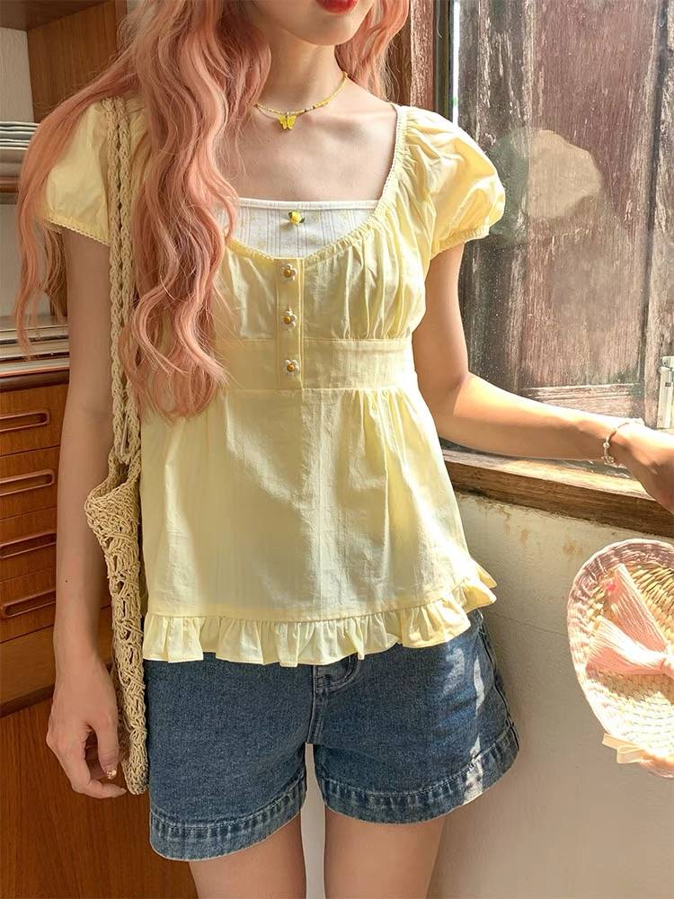 夏装搭配一整套少女感奶酪黄纯色上衣 吊带背心两件套