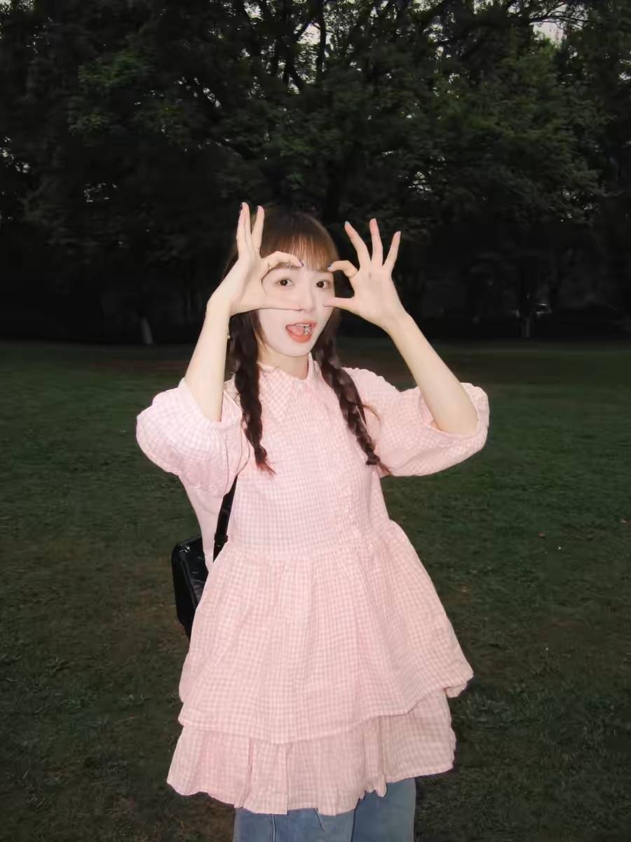 粉色灯笼袖格子蛋糕衬衫女夏季Polo领百搭可爱短袖宽松小个子上衣