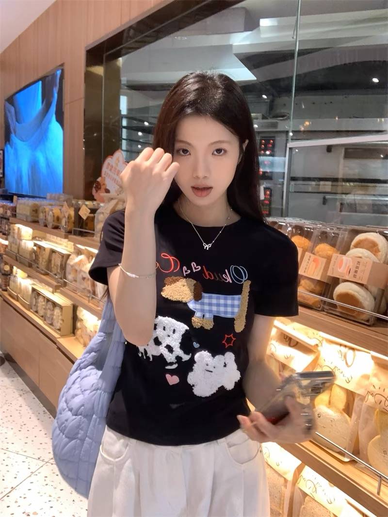 甜辣风小狗毛巾绣短袖T恤女夏季正肩修身短款上衣
