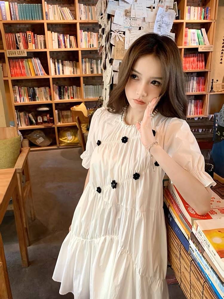 白色初恋泡泡袖连衣裙女设计感小众夏24高腰公主裙