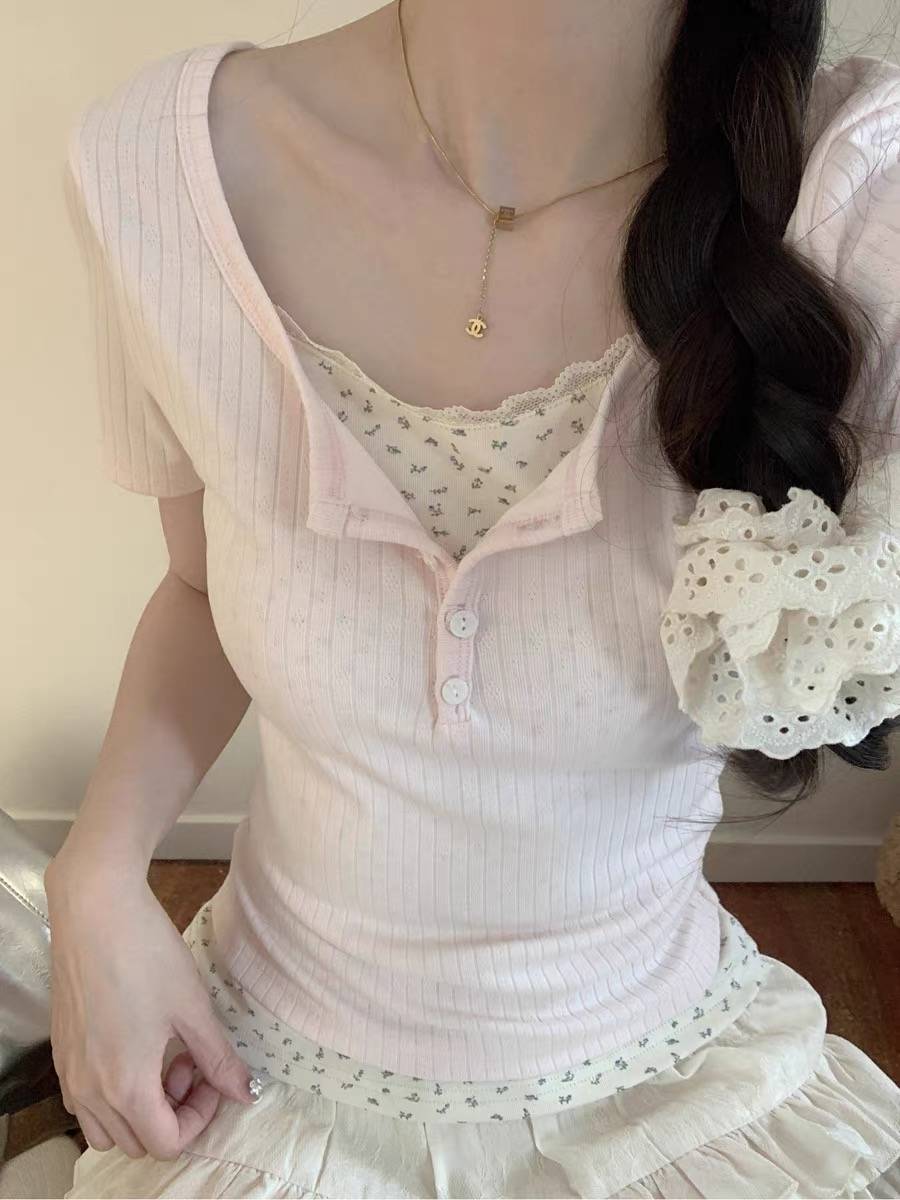 明天穿什么U小香风蓝色拼接蕾丝假两件短袖t恤女夏季正肩小碎花纯欲辣妹上衣