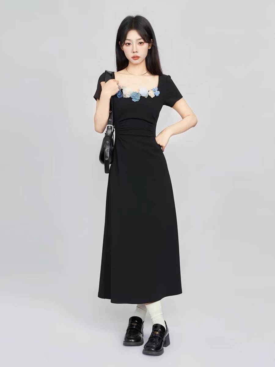 明天穿什么U赫本风短袖连衣裙女夏季长裙收腰方领小众纯欲花朵裙子