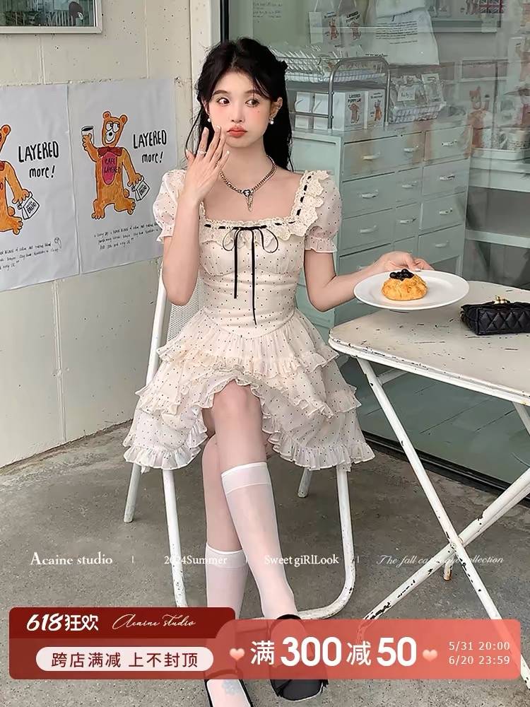 明天穿什么U中长款方领泡泡袖波点小蛋糕连衣裙女夏季法式复古气质裙子