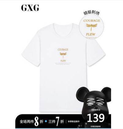GXG男装2019夏季新款白色圆领潮流潮牌刺绣短袖T恤男士情侣装体恤
