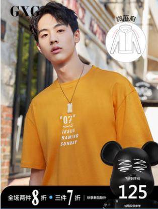 GXG男装2019夏季新款短袖T恤男纯棉印花圆领黄色潮牌男士潮流体恤