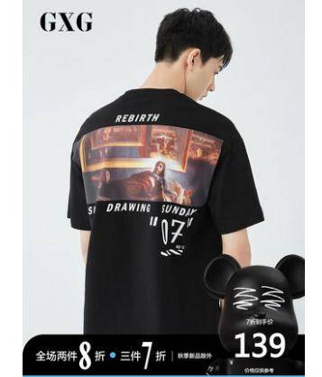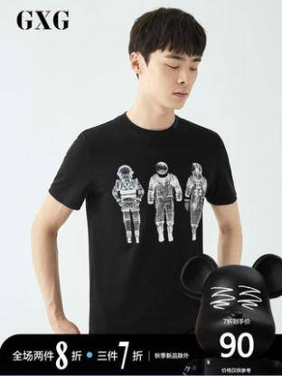 GXG男装 短袖T恤男2019夏季新款黑色男士体恤印花打底衫潮牌潮流