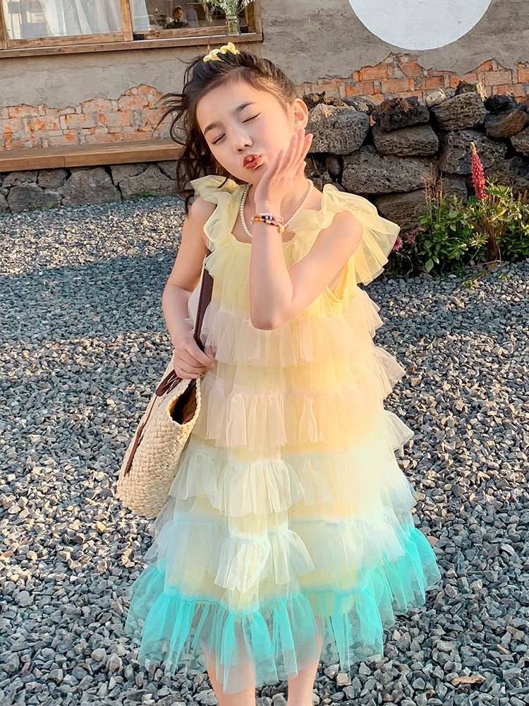 女童连衣裙夏季2023新款公主裙吊带小女孩彩虹无袖裙子儿童夏装