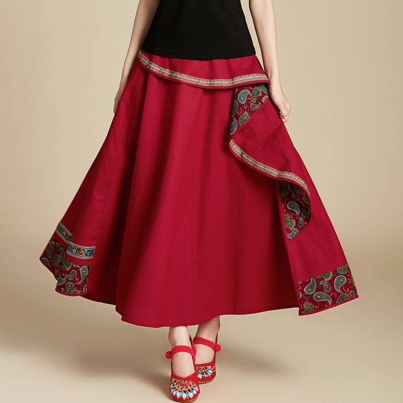 民族风女装春秋冬季大码棉麻大摆复古a字裙显瘦印花云南半身长裙