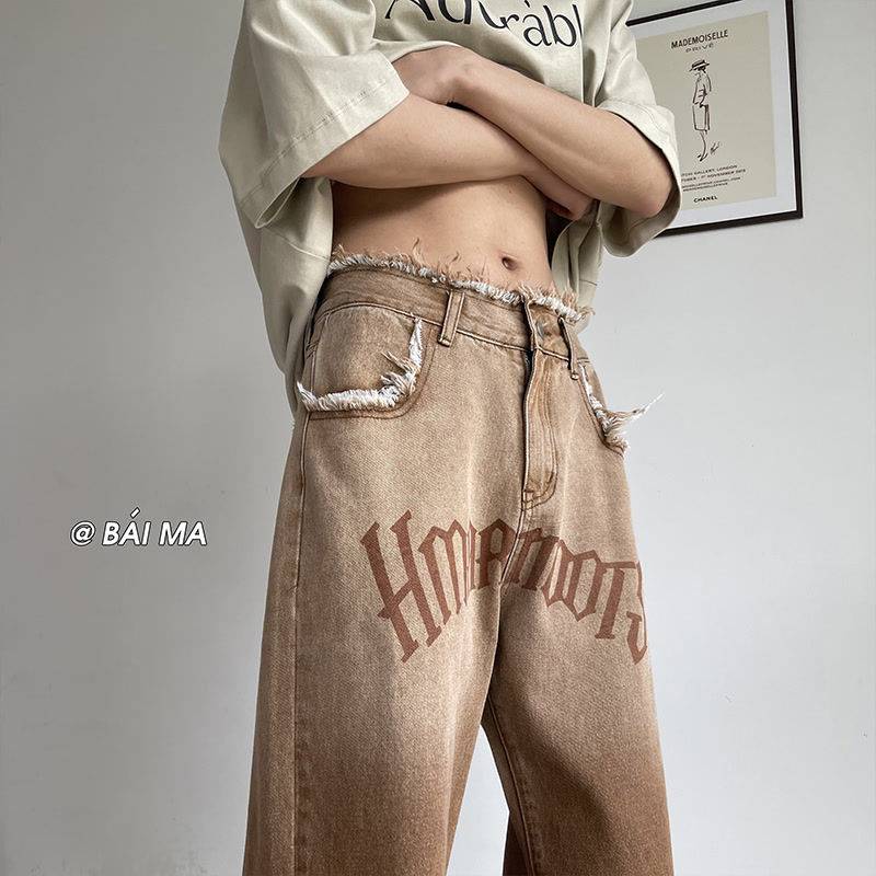 棕色美式复古牛仔裤男高街字母渐变hiphop裤子潮牌宽松毛边直筒裤