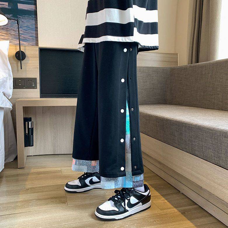 腰果花假两件排扣裤男春秋季潮牌高街宽松学生直筒休闲运动卫裤男