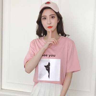 2018春夏新款韩版女装卡通小猫咪印花修身短袖纯棉圆领t恤