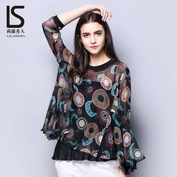 2018春季新品欧美女装印花真丝上衣女t恤不规则下摆