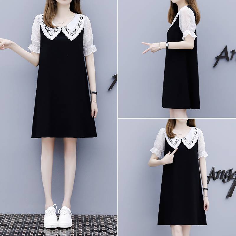 欧洲站2021年夏天新款女装宽松大码遮肚娃娃领小黑裙a字连衣裙子