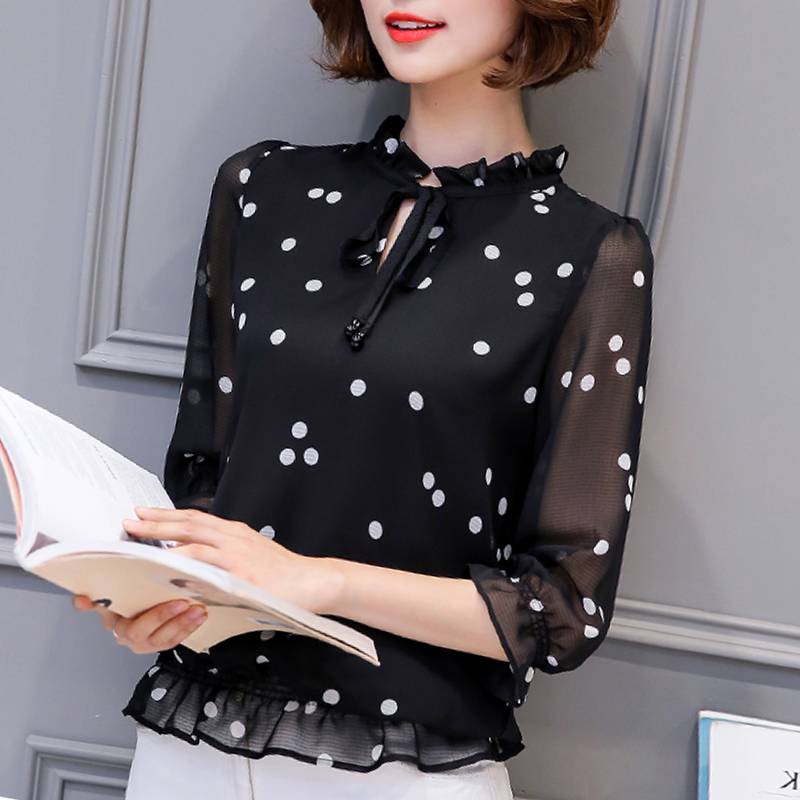 雪纺衫女2018新款春秋装大码女装波点短款喇叭七分袖宽松上衣百搭