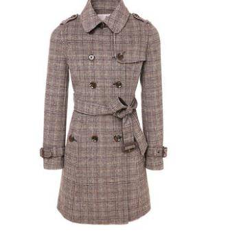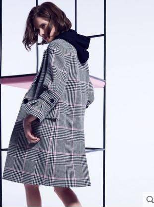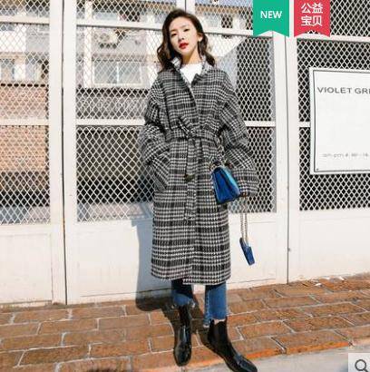 秋冬2018新款英伦格纹双排扣系带毛呢大衣外套女