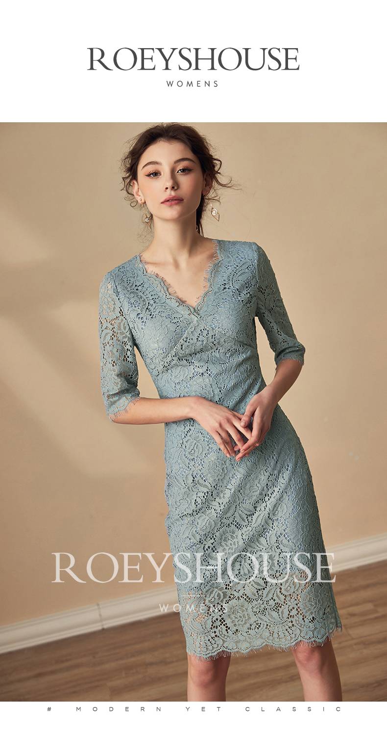 罗衣原创蕾丝连衣裙2019春夏新款气质雾蓝色修身淑女中长裙子7108