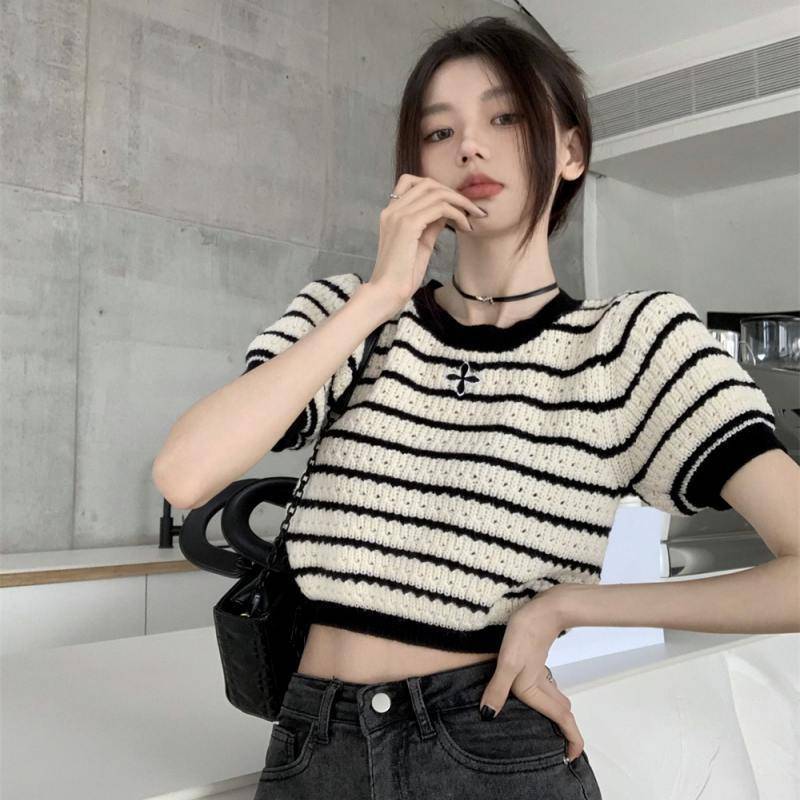 条纹镂空泡泡袖短款T恤女夏季新款设计感圆领别致辣妹上衣