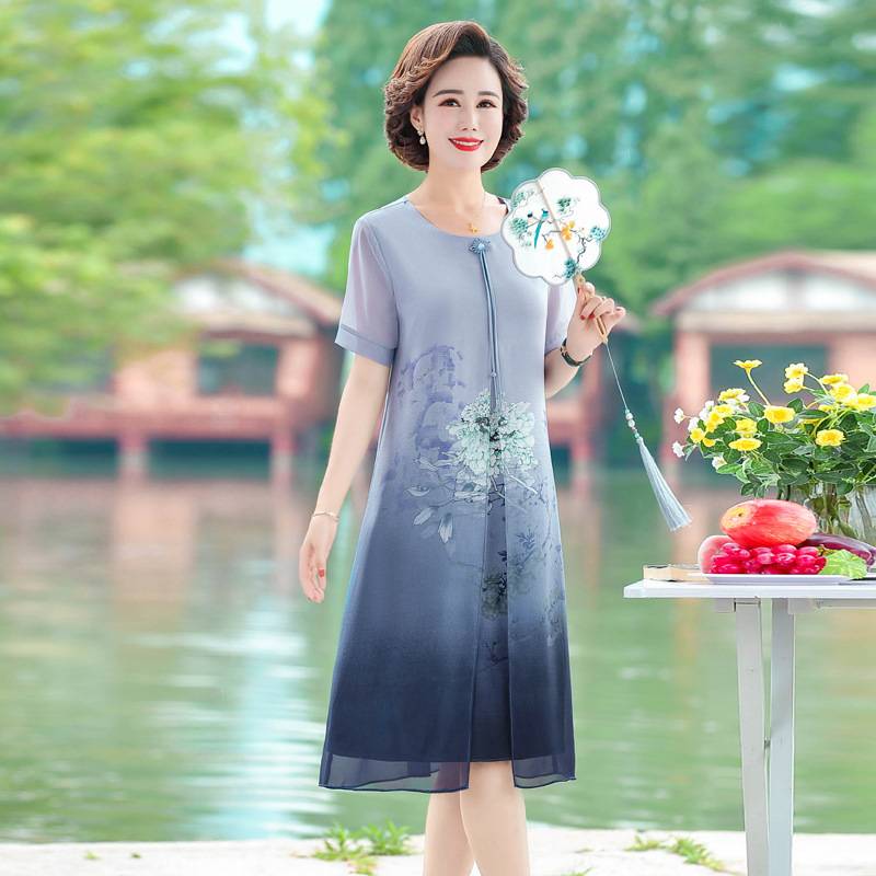 妈妈夏装洋气高贵雪纺连衣裙2023年新款中年短袖宽松印花中老年人