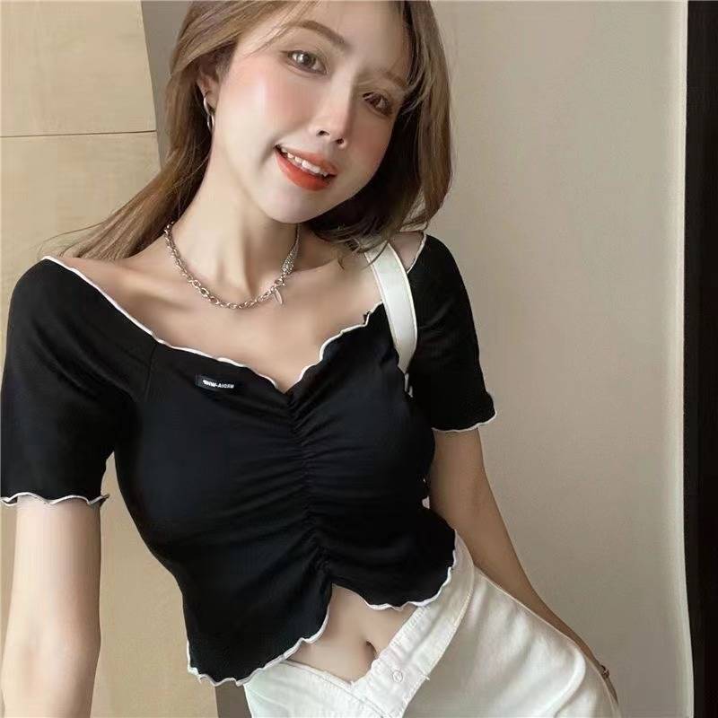 金羊家纯棉螺纹棉 纯欲辣妹风短袖T恤女夏设计感木耳边露肩上衣