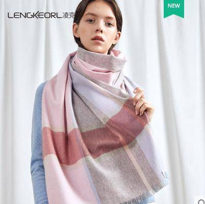 凌克羊绒围巾女秋冬季粉色格子羊毛围巾披肩韩版百搭加厚两用围脖