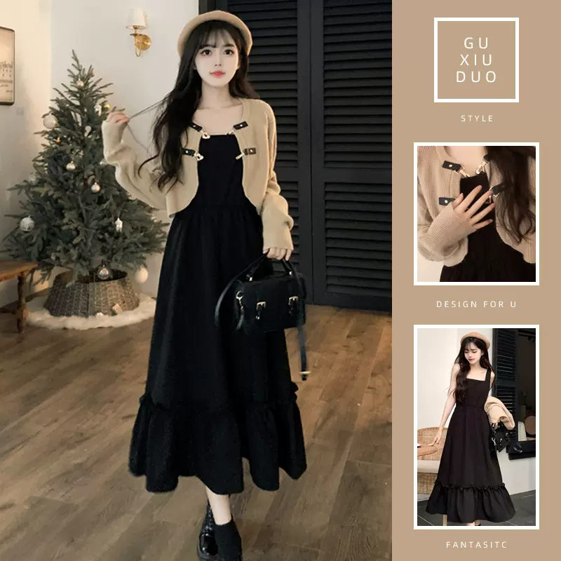 深秋冬季女装2023微胖茶系穿搭一整套今年流行漂亮连衣裙子两件套