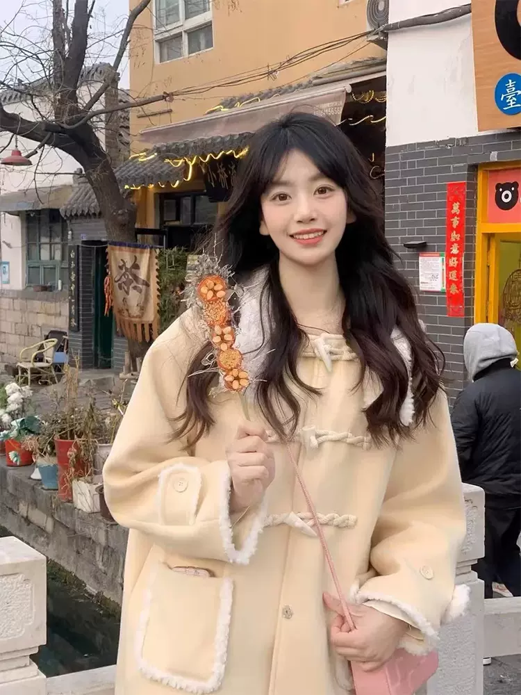 淡黄色羊羔毛拼接牛角扣中长款毛呢外套秋冬季圣诞高级感呢子大衣
