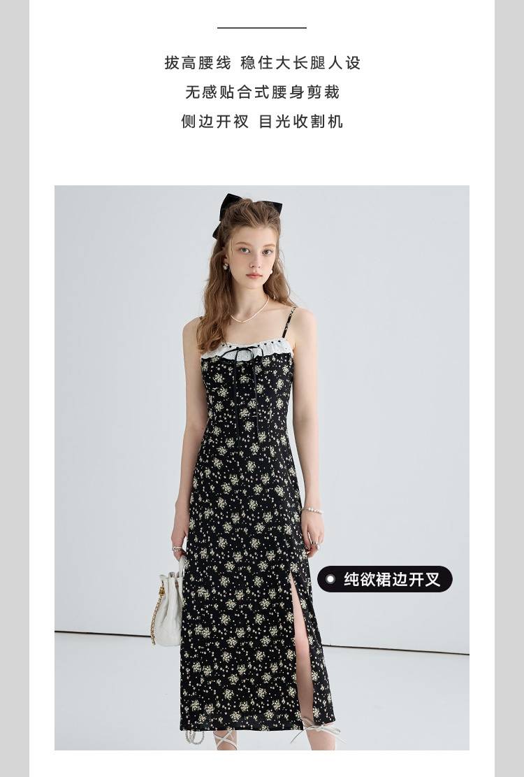 黑色碎花连衣裙夏2023新款女装法式小众开叉茶歇裙子
