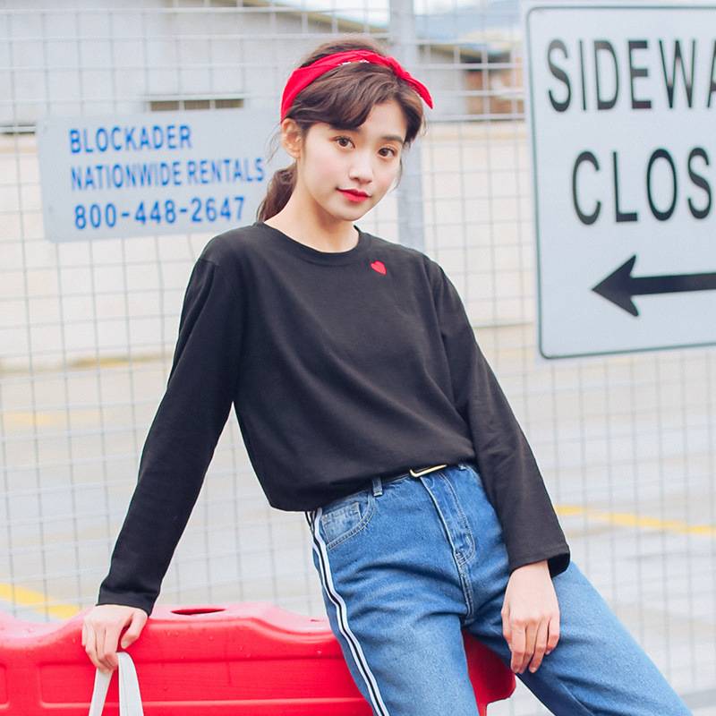 2018秋季新款韩国爱心刺绣宽松小清新百搭简约圆领学生长袖T恤女