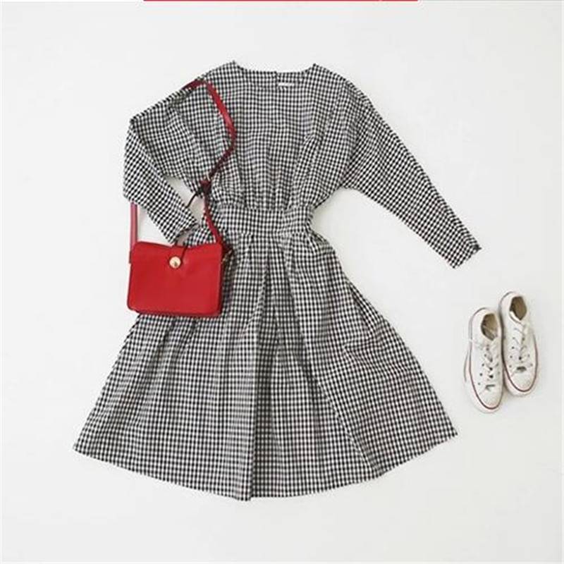 春装新款国风文艺小清新圆领格子中长裙复古学生范收腰显瘦连衣裙