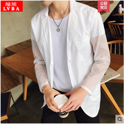 夏季男士休闲西服外套薄款上衣大码防晒衣男装白色韩版透明防晒服(5折优惠)